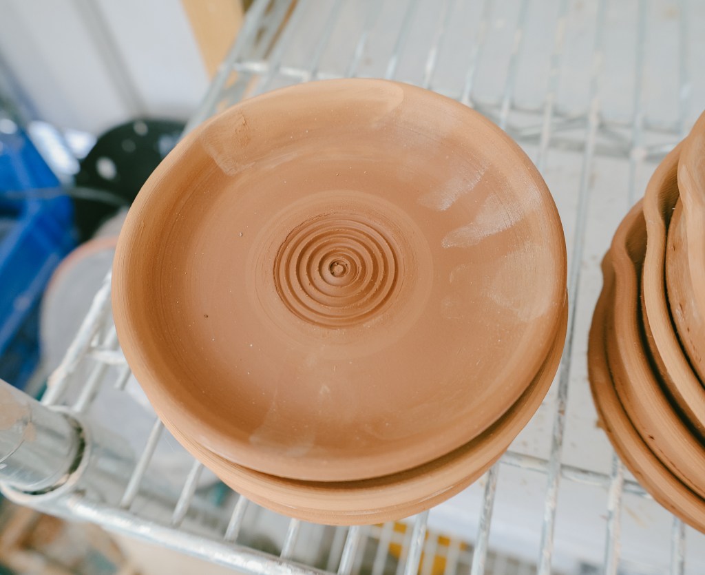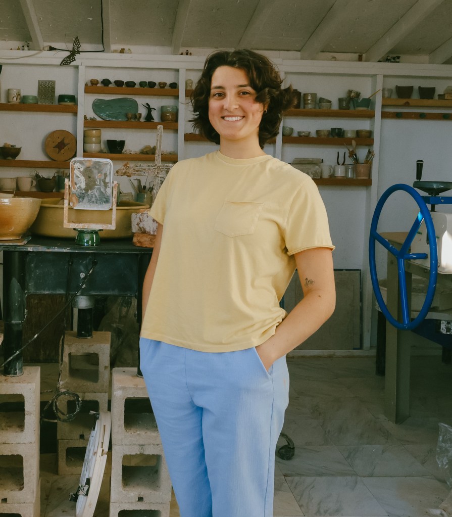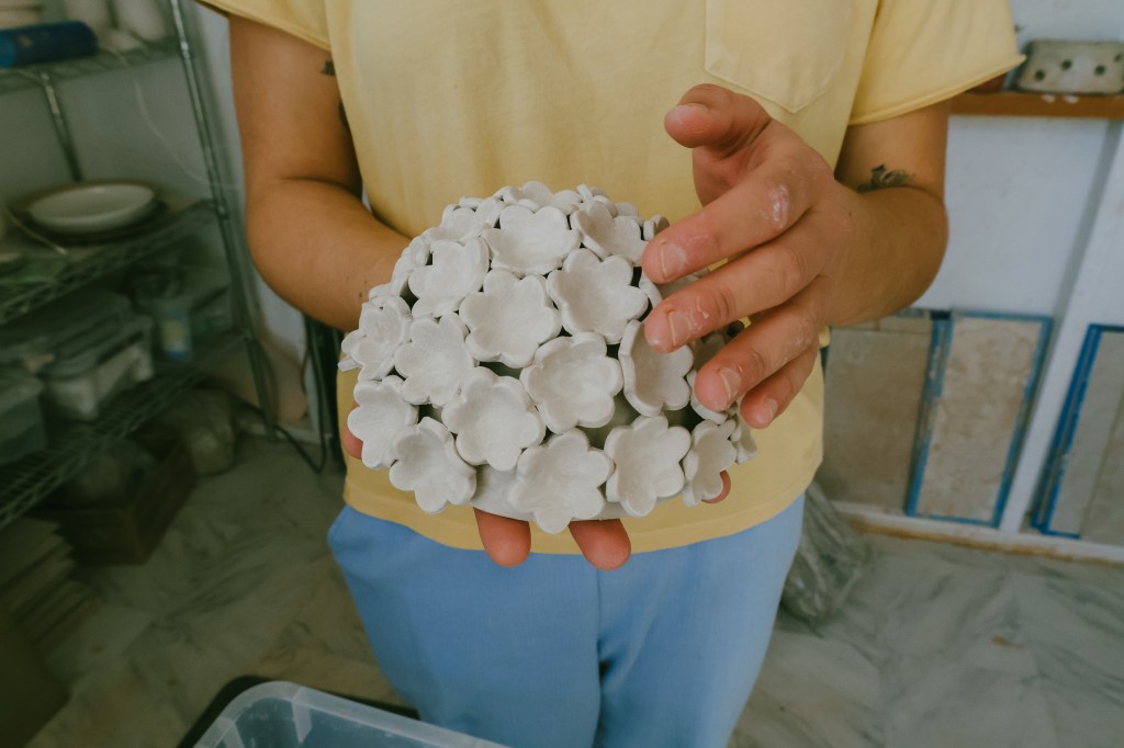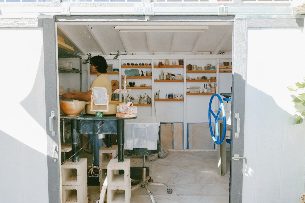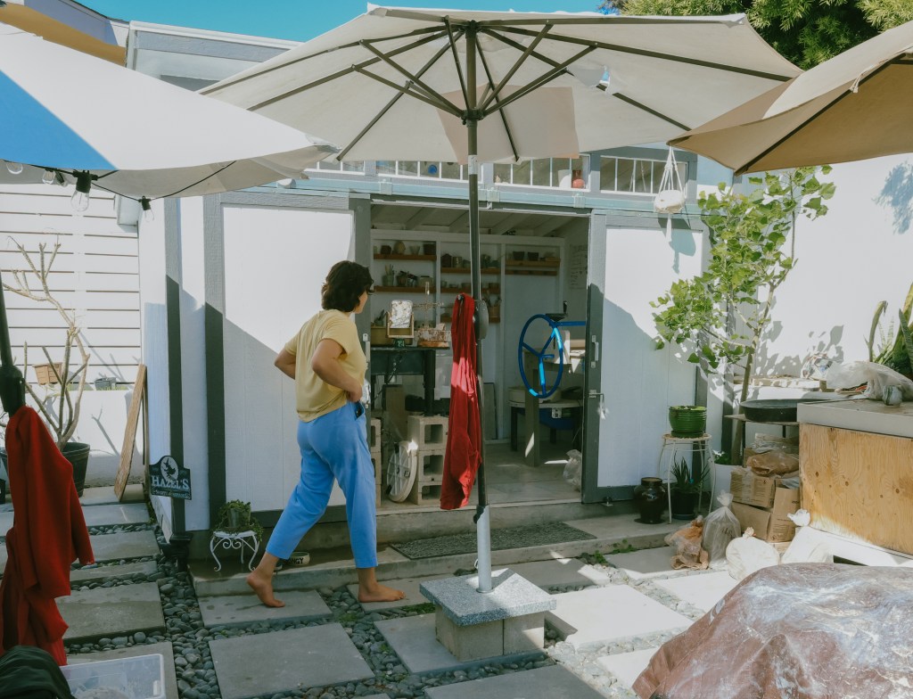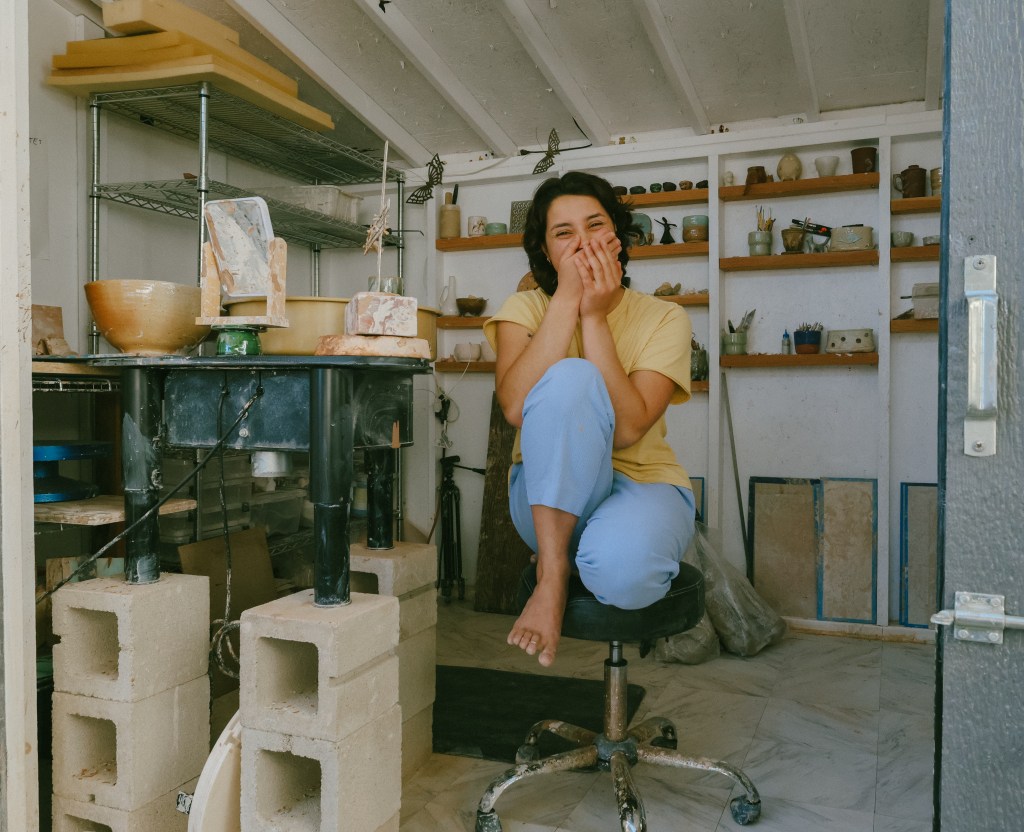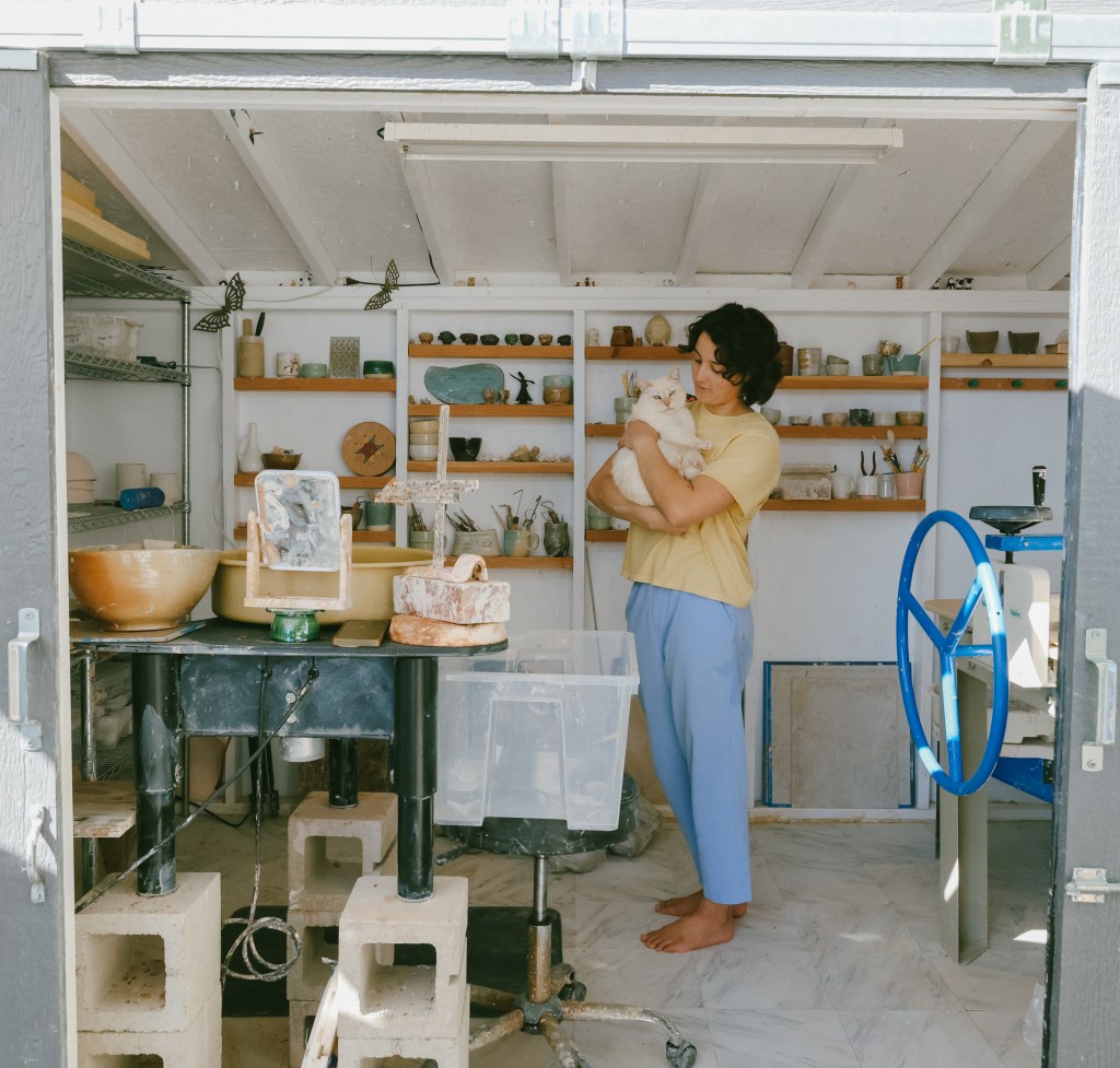 “I made my own sink,” she laughs, brushing past rows of drying porcelain. “I just like to be comfortable.”