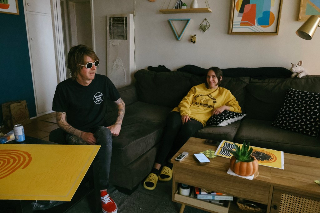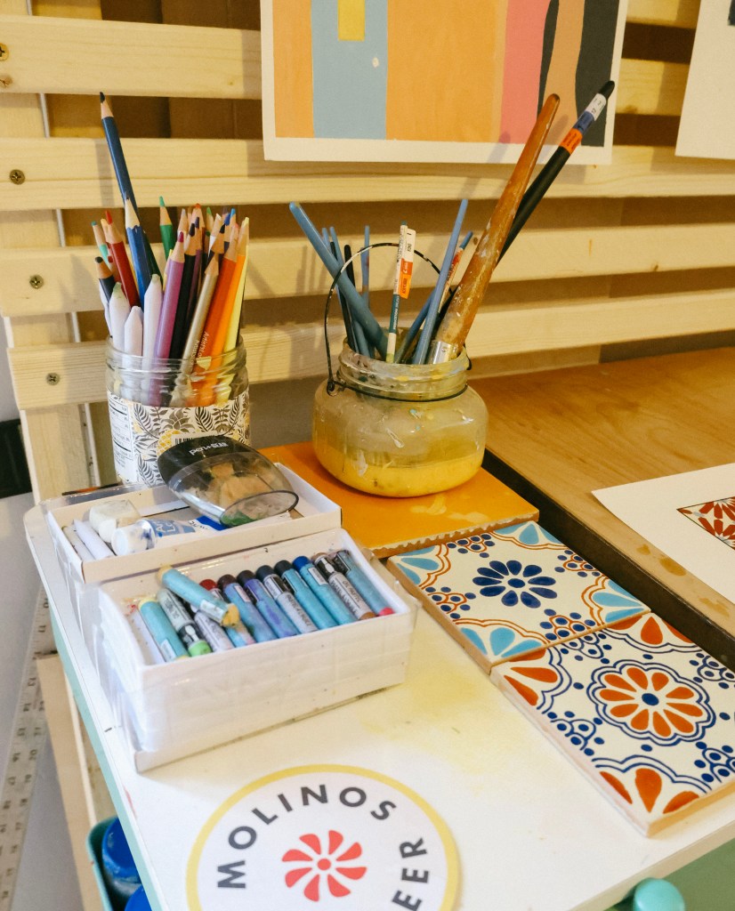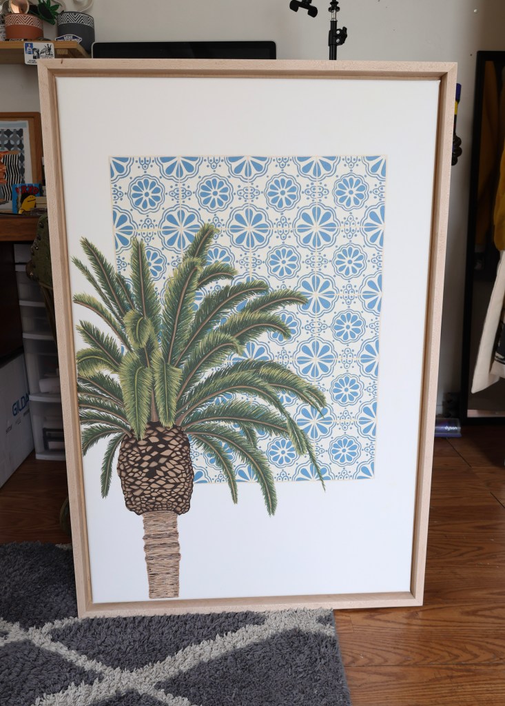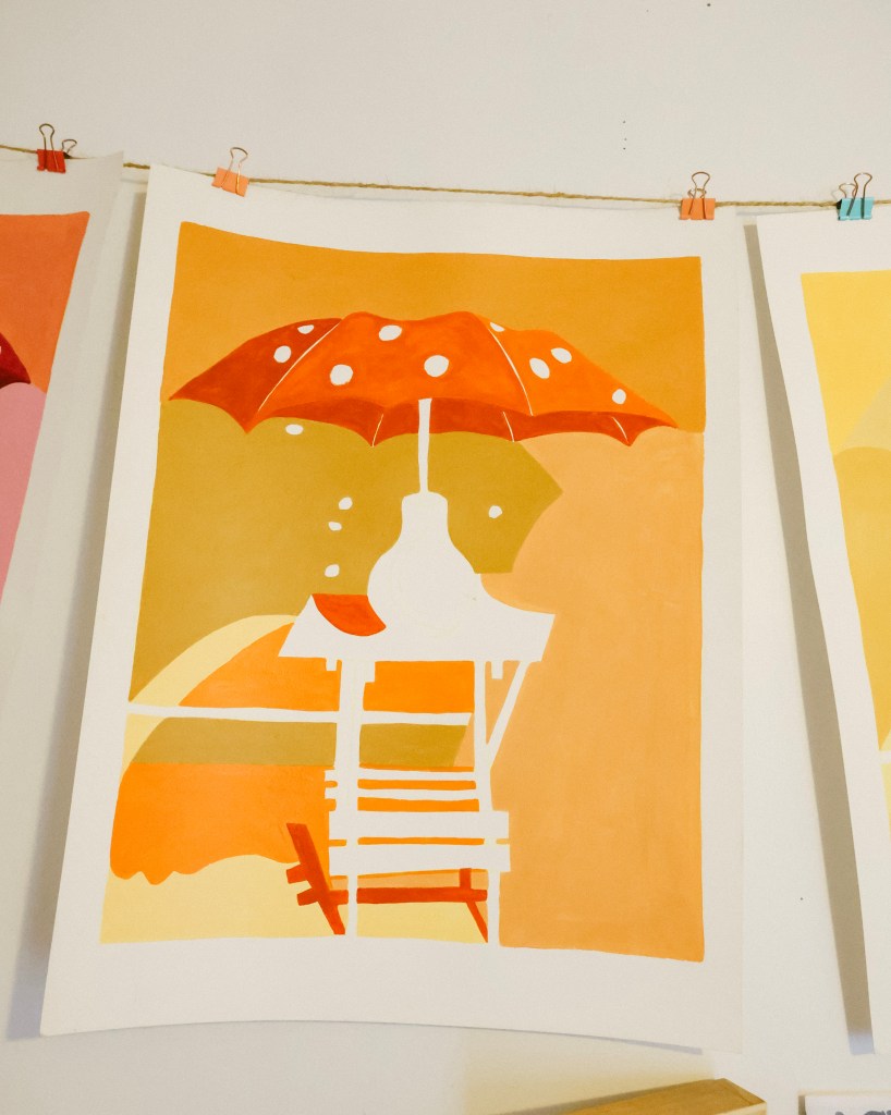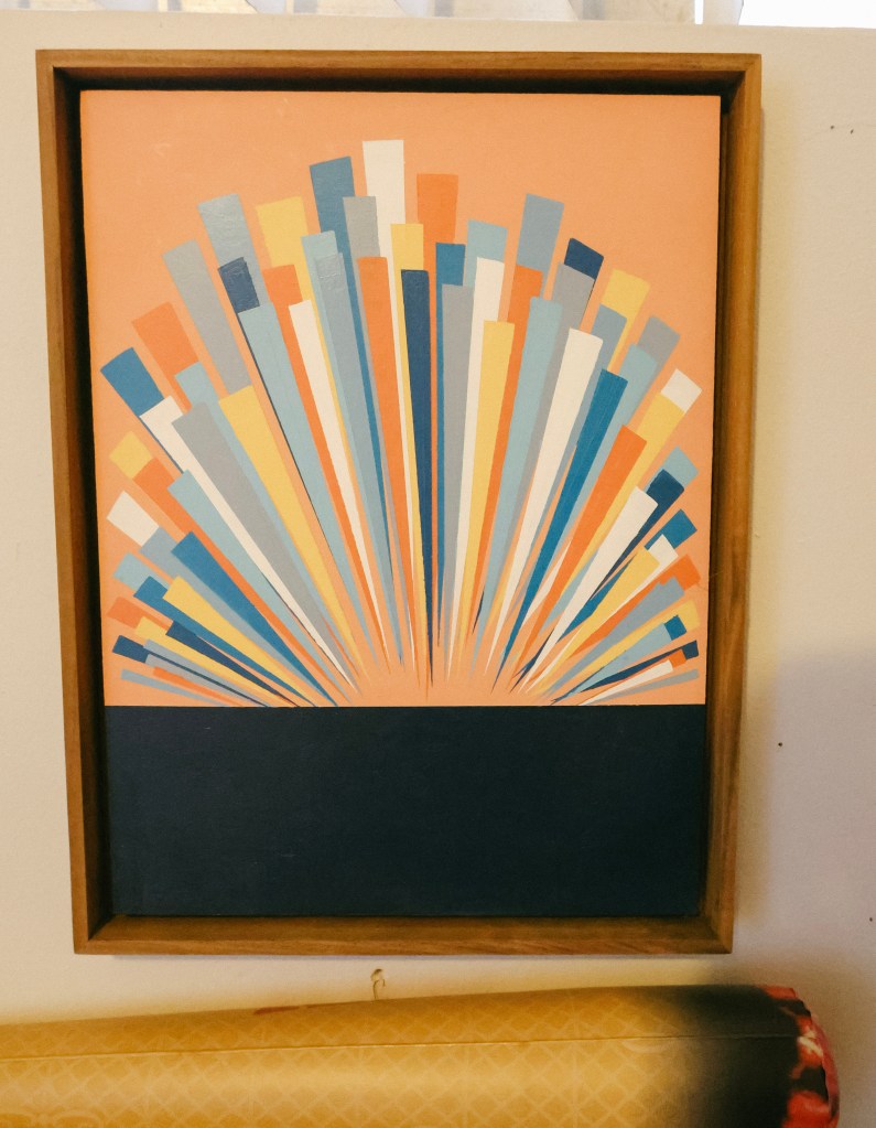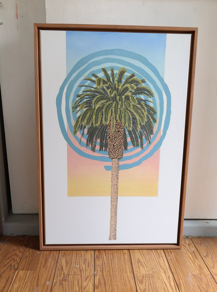 And it shows. His paintings are full of saturated color, bold forms, and personal meaning. They carry the feeling of summer and familiarity, and each one is based on real locations. “There’s always a hint,” he said. “The painting titles usually give away the place.” They’re like a visual scavenger hunt, connecting California cities, desert drives, and everyday magic.