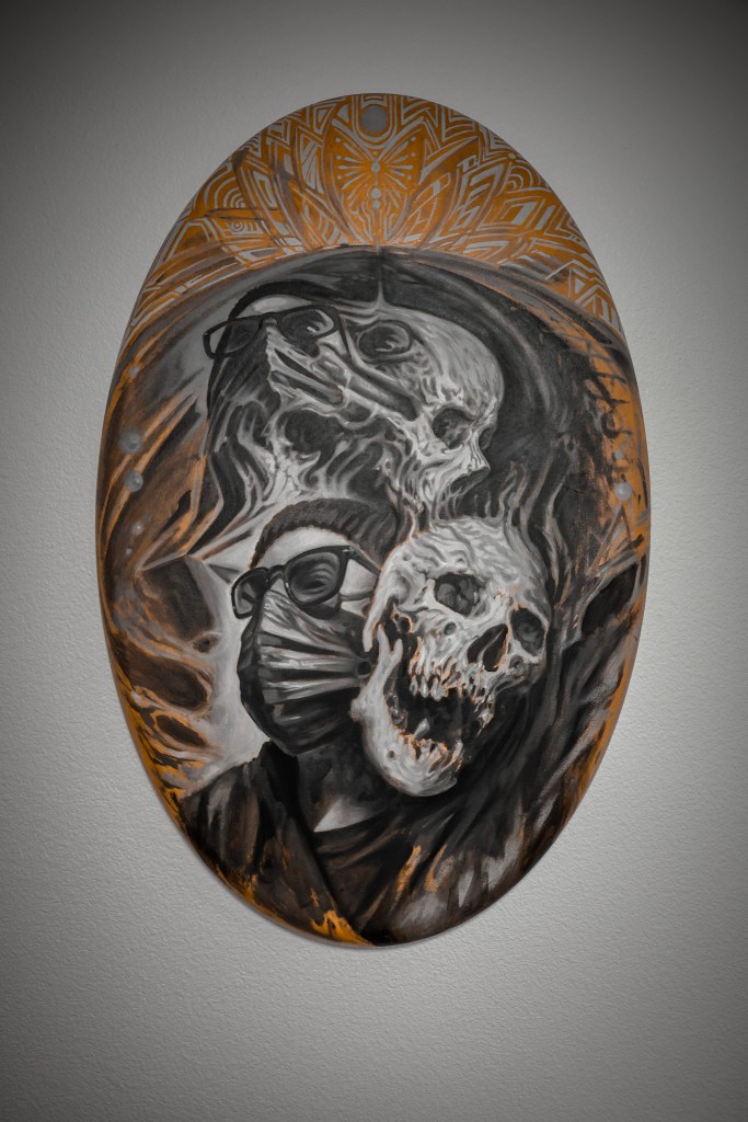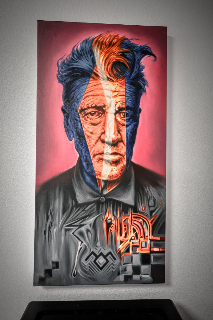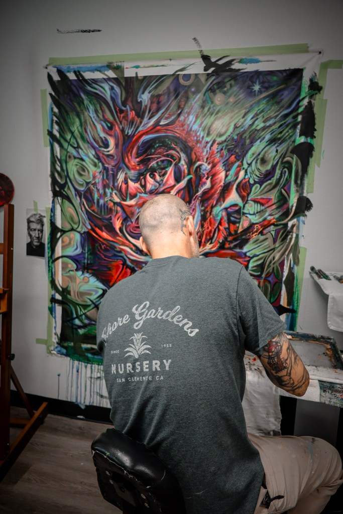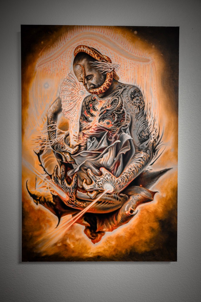 He describes his paintings as internal—slow and meditative, often born from a specific vision. He’ll see an image clearly in his mind and feel a compulsion to bring it to life.