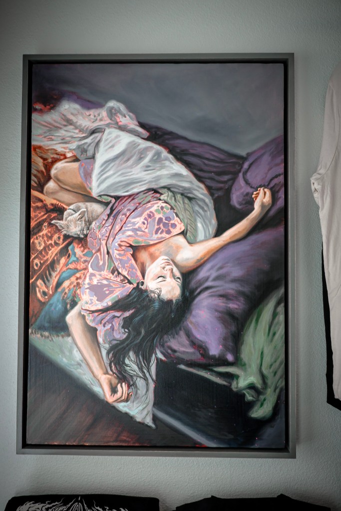Matthew’s work straddles two worlds: fine art and tattooing. On one side, he paints intricate, detailed canvases—pieces that take months and demand solitude.