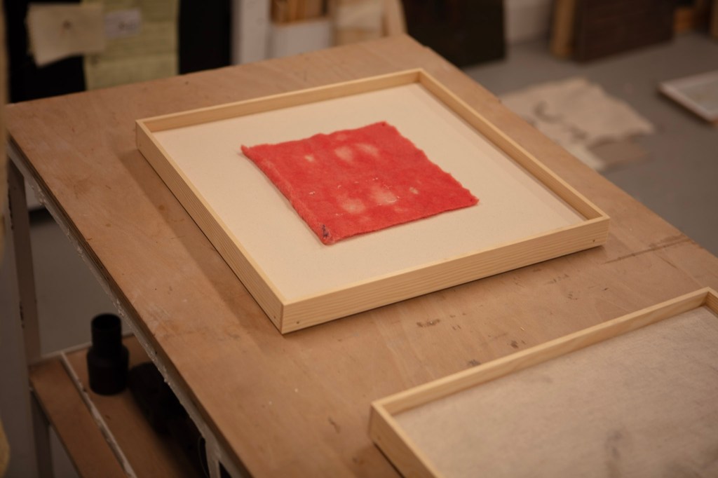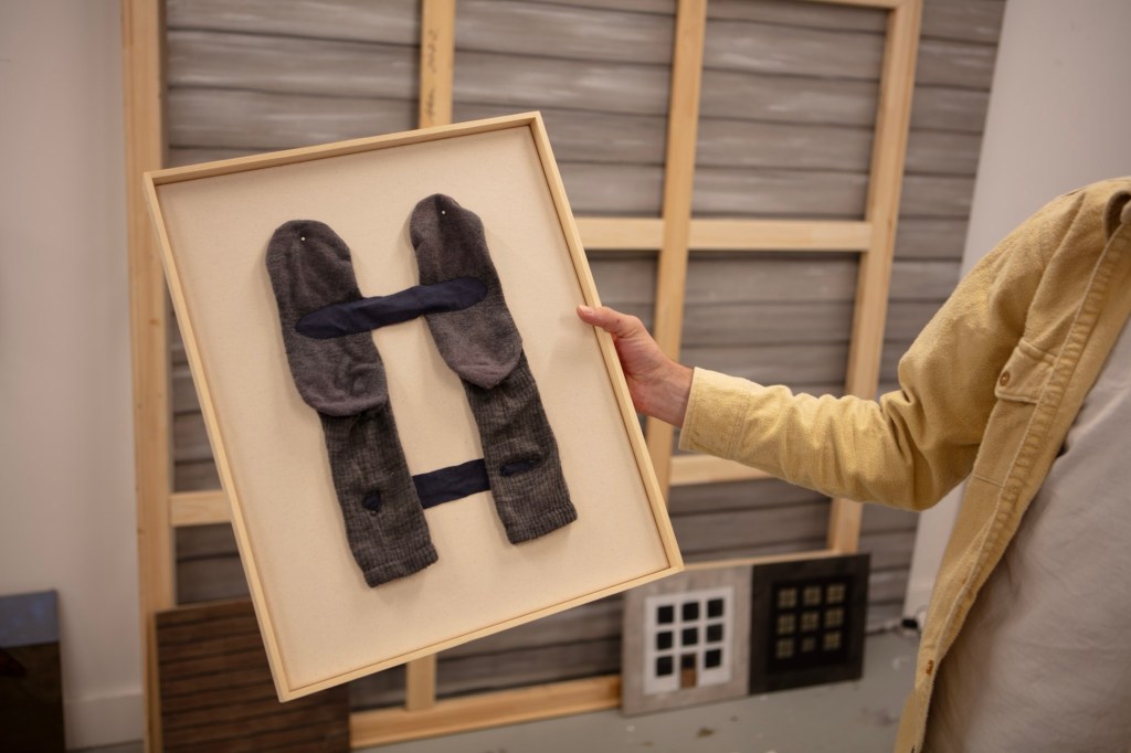 Despite the conceptual layers in his work, Ethan wants it to be approachable. Pieces like his framed socks invite people to lean in, to examine closely, even to laugh.
