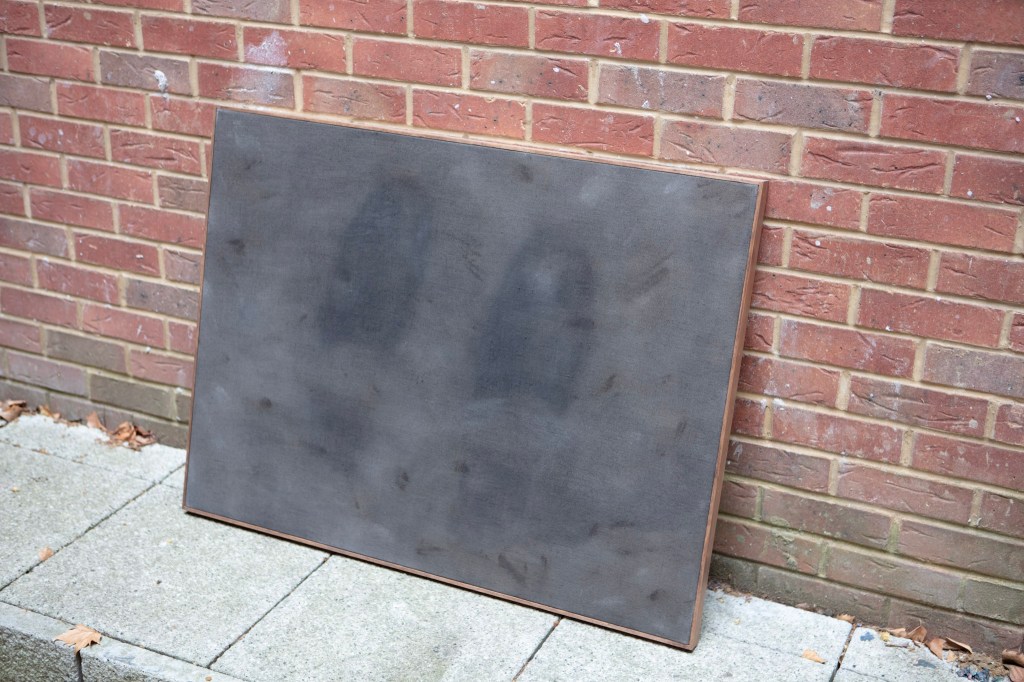 Not all of Ethan’s work is instantly decipherable. A painting titled Checking the Obituaries Again features faint boot prints, barely visible in black-on-black paint and charcoal. It’s ghostly, almost evasive. The title guides you, but never explains everything.