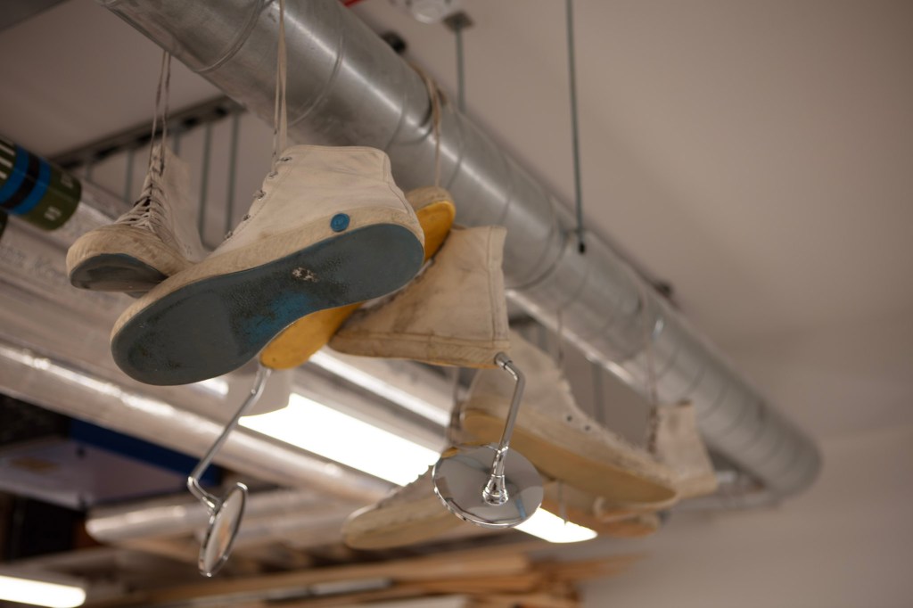 Many of Ethan’s pieces memorialize items that have carried him — literally. His sneaker series, ongoing for over a decade, transforms worn-out shoes into sculptures, sometimes with gold leaf on the soles. His sock works — repaired until they’re no longer wearable — are stretched and framed like preserved specimens.